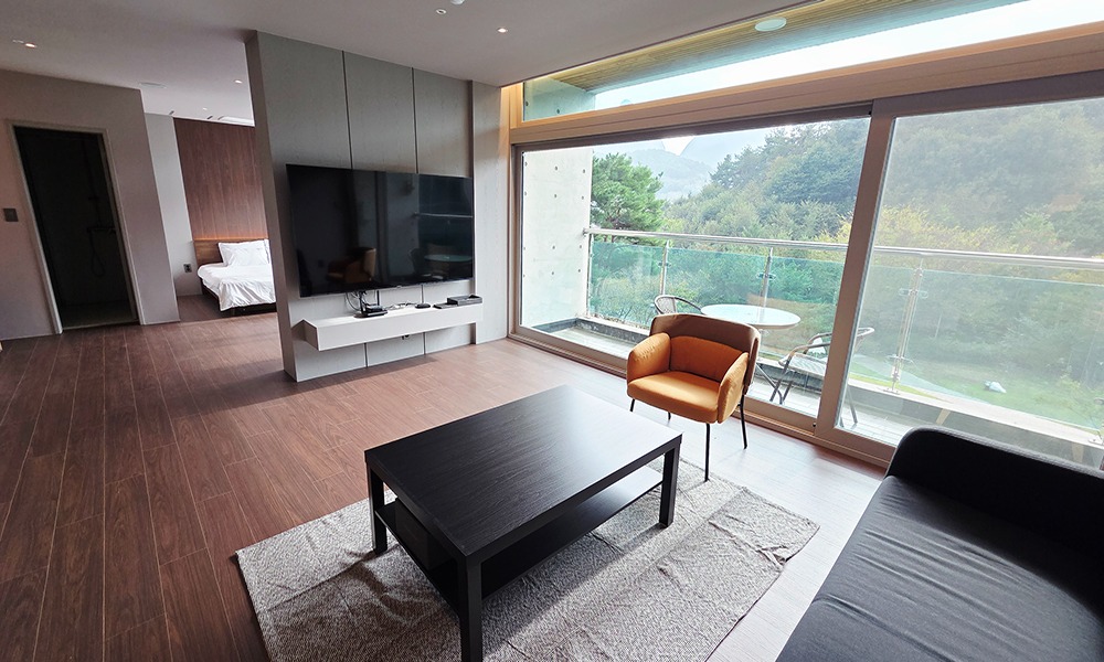 탁 트인 통창 너머로 마이산의 풍경이 펼쳐지는 디럭스룸은 여유로운 공간과 세련된 인테리어가 어우러진 객실입니다. 은은한 조명과 따뜻한 우드톤이 조화를 이루어 하루의 피로를 풀고, 고요한 자연 속에서 편안한 쉼을 누리실 수 있습니다. 거실과 침실이 분리된 구조로 설계되어 휴식과 업무, 두 가지 목적 모두에 적합한 프라이빗한 공간입니다.